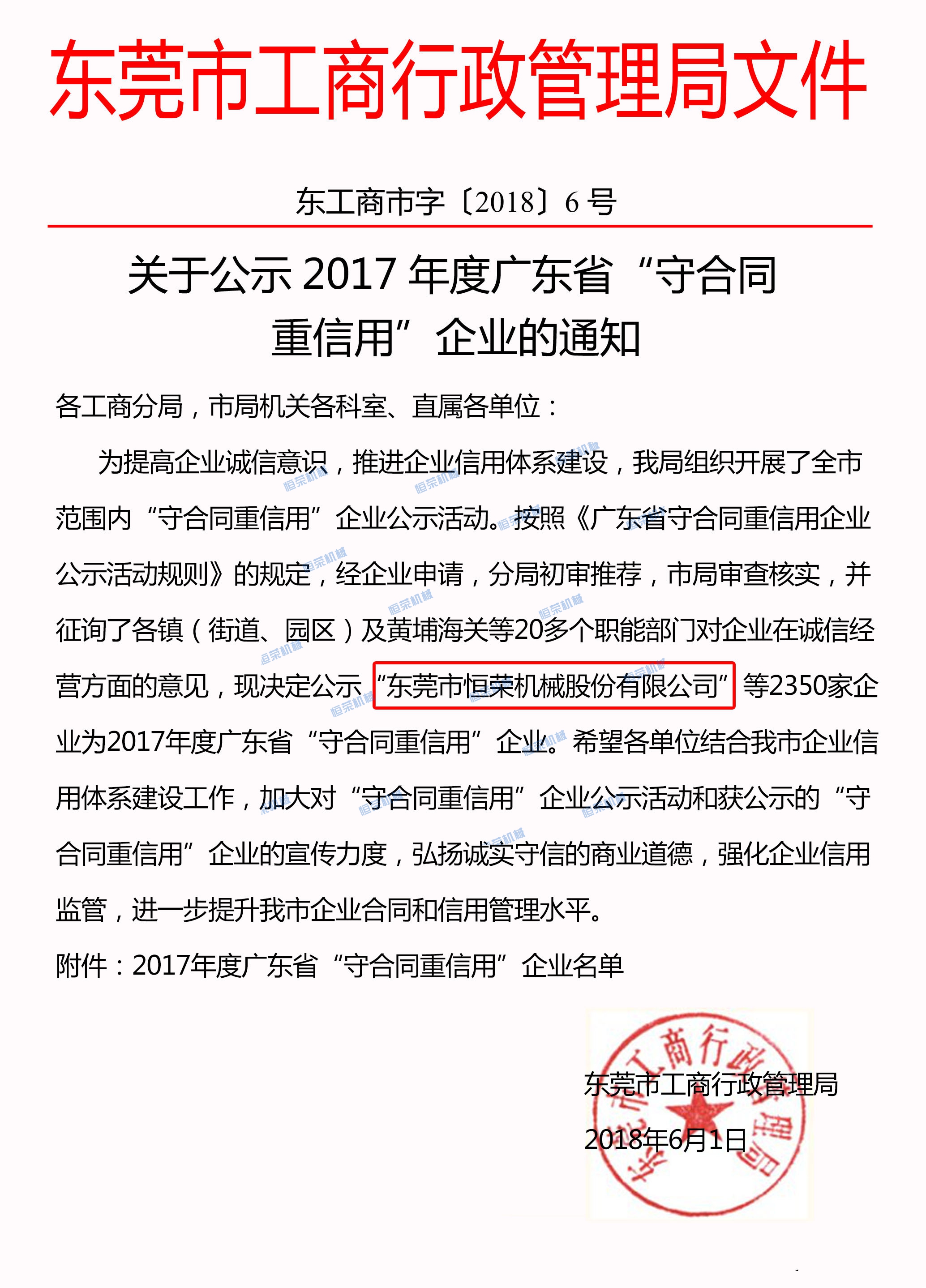 日前,廣東省工商行政管理局在網(wǎng)上公示了“守合同重信用企業(yè)”申報程序及考評標準,經(jīng)相關(guān)機構(gòu)重重篩選、嚴格評定,我公司被評為“2017年度市級守合同重信用企業(yè)”。